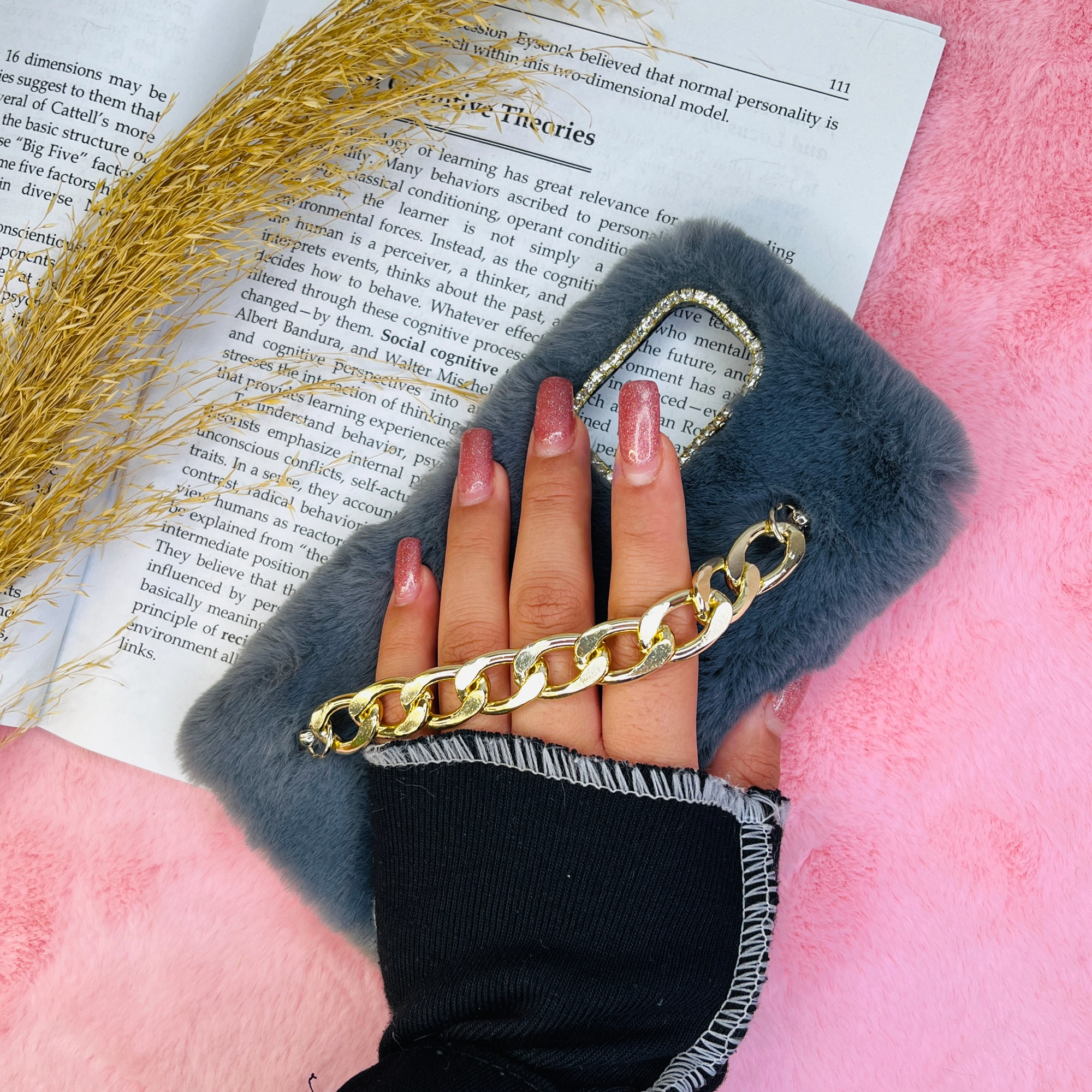 این قاب از دولایه ساخته شده که لایه داخلی از جنس ژله ای و لایه بیرونی از خز سوپر الیاف ساخته شده و ساختاری نرم و جذاب دارد در قسمت پشتی قاب دستنبندی با زنجیر فلزی طلایی رنگ ثابت به کار برده شده که باعث شده جای دست بسیار مناسبی داشته باشد
